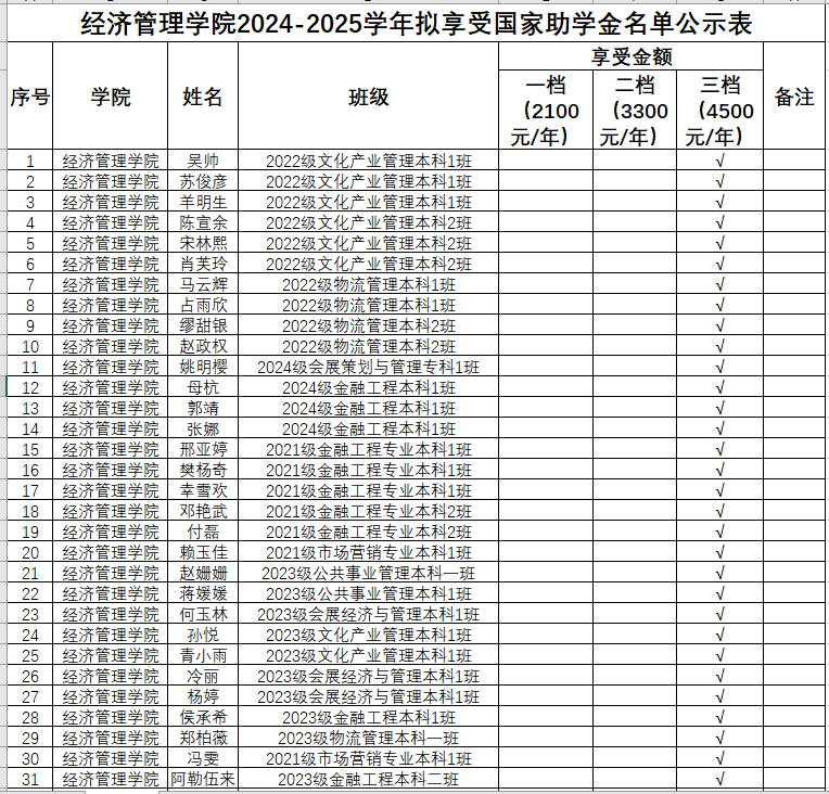 具体名单见《经济管理学院2024-2025学年拟享受国家助学金名单公示表》